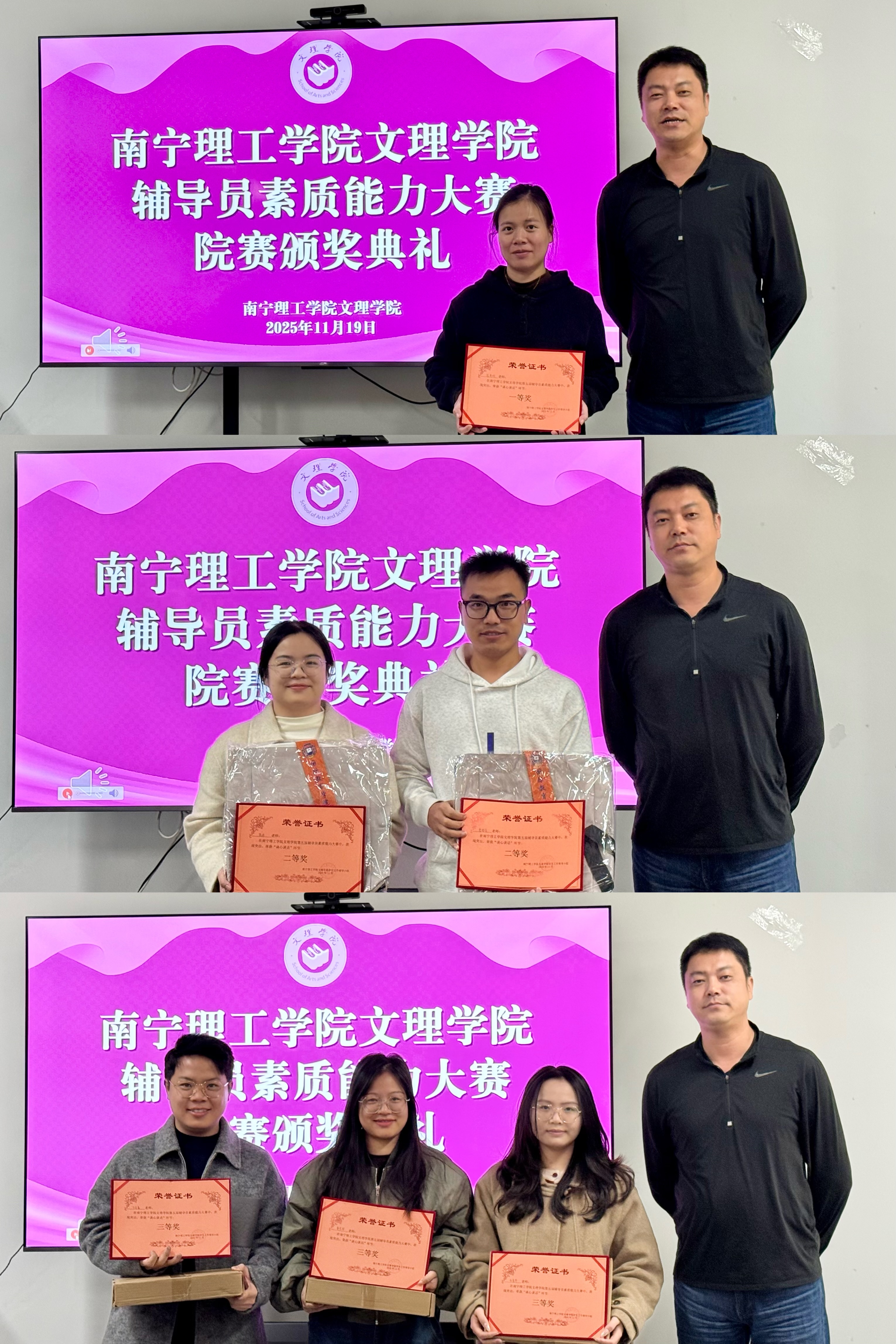 活动尾声,文理学院党总支书记孙宝会为获奖辅导员颁发荣誉证书与奖品。手中的奖牌既是对他们专业素养、育人初心的认可,也是对全体辅导员深耕学生工作、精进业务能力的激励。获奖辅导员们面带笑容、身姿挺拔,接过的不仅是一份荣誉,更是立德树人的责任与使命,现场掌声阵阵,传递着对辅导员队伍潜心育人、匠心筑梦的敬意,也凝聚起全院上下共同赋能学生成长、携手迈向教育新征程的奋进力量。