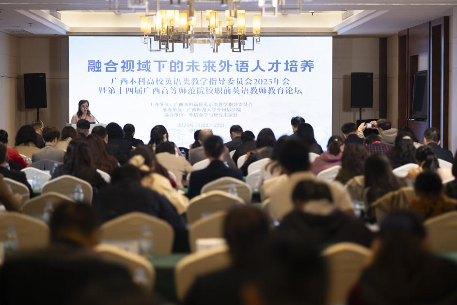 11月22日,广西本科高校英语类教学指导委员会2025年会暨第十四届广西高等师范院校职前英语教师教育论坛于桂林隆重召开。本次会议由广西师范大学承办,汇聚了区内外外语教育领域的知名专家、学者及一线教师,共同围绕“融合视域下的未来外语人才培养”这一核心主题展开深入研讨。taptap点点体育新视域文化产业学院高度重视此次学术盛会,委派英专教研室骨干教师张翰全程参会学习。
