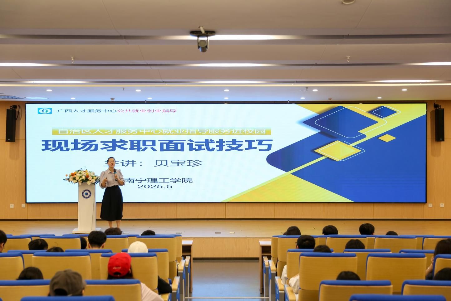 贝宝珍老师作为本次讲座主讲嘉宾,深耕人力资源领域十余年,曾担任广西公共频道《挑战技能王》第一季市场营销专业面试官,并曾在上市集团公司主导校园招聘及管培生培养工作,对企业用人标准与招聘全流程具有深刻洞见。讲座中,贝老师结合自身经验,以“理论+案例+模拟”的形式,围绕现场面试类型、特点及应对技巧展开深度解析。