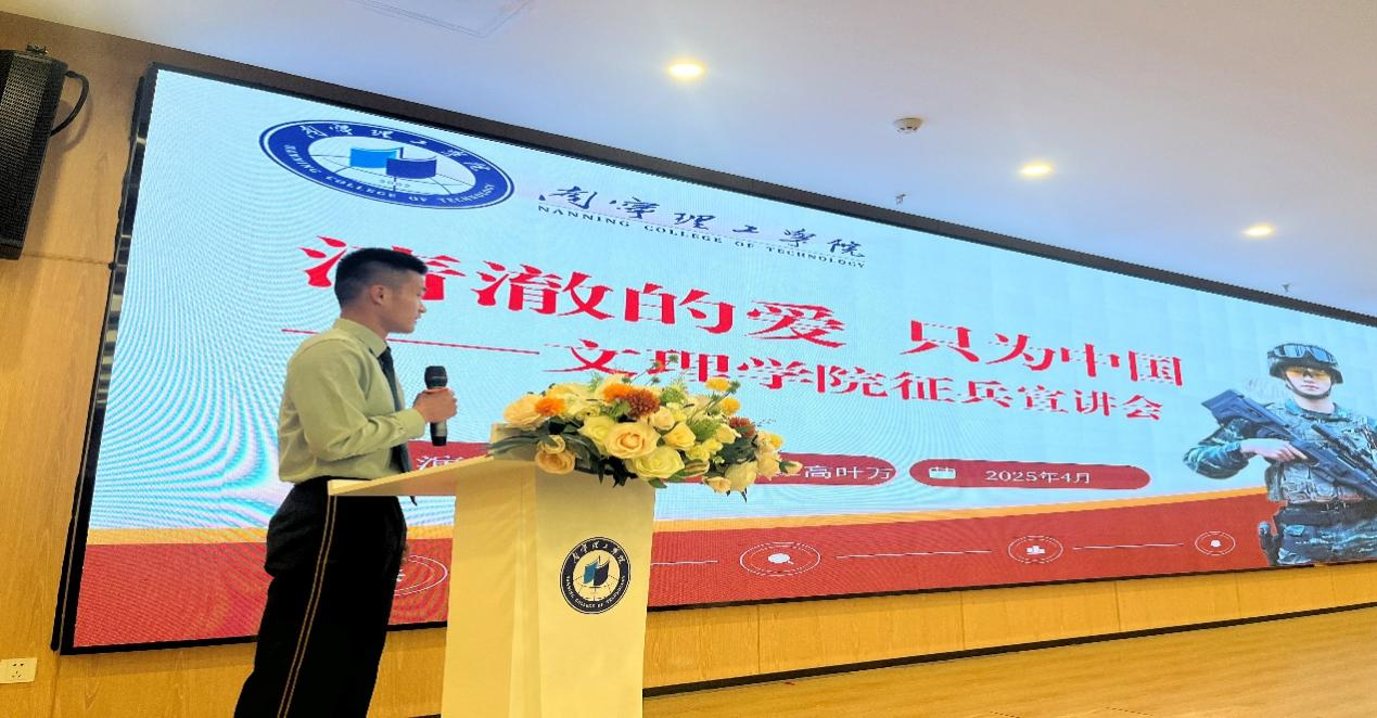 宣会上,覃学鹏老师针对2025年征兵政策,从应征报名、体格检查、政治考核、役前教育以及优待政策等多个方面,为同学们进行了全面且深入细致的解读,并结合身边真实案例进行剖析,阐释政策要点,鼓励同学们积极参与征兵报名,在军队中锤炼自我,为国防事业贡献力量。