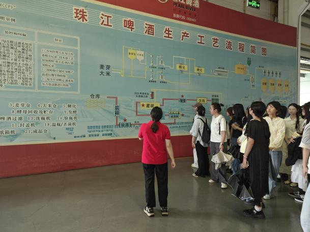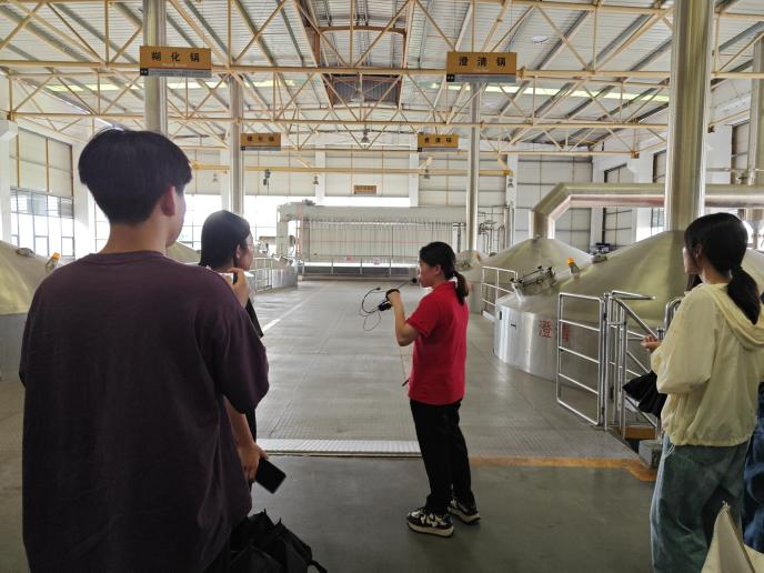 在广西珠江啤酒有限公司在原料筛选区,学生们目睹工作人员仔细甄别麦芽和啤酒花,理解了原材料质量对于啤酒品质的“基石”作用。在糖化、发酵车间,设备有序运转,温度和时间精准把控。学生们了解到,温差和时间都可能影响啤酒的口感与风味。在这里,他们感受到了生产过程中的每一个细节都关乎着成本与品质的平衡。