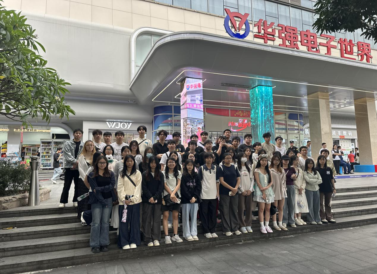 当天下午,学生们来到了华强北。华强北作为中国电子数码行业的重要地标,其电子数码行业、化妆品行业、手机及配件行业供应链等丰富多样的商业形态,吸引着全球的目光。学生们实地走访多家企业,深入调研。在电子产品市场,琳琅满目的电子元器件、先进的数码产品让学生们目不暇接;在化妆品店铺,他们了解到产品从生产到销售的复杂供应链环节;在手机及配件商铺,他们目睹了中国制造业高效且灵活的运作模式。通过实地调研,学生们理解了中国制造业 “大而全” 与 “快而廉” 的双重特性,为后续学习供应链管理、跨境电子商务等专业课程建立了坚实的认知锚点。
