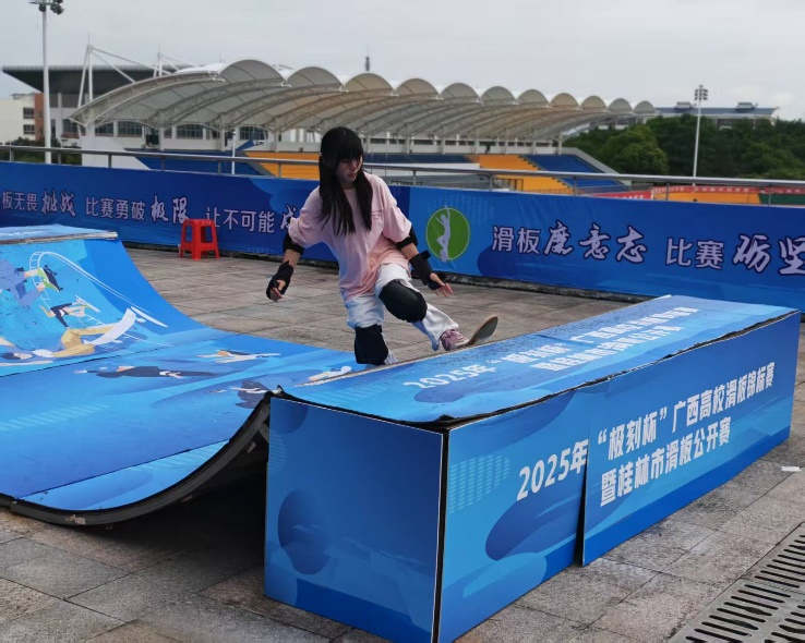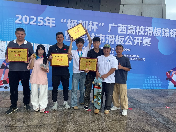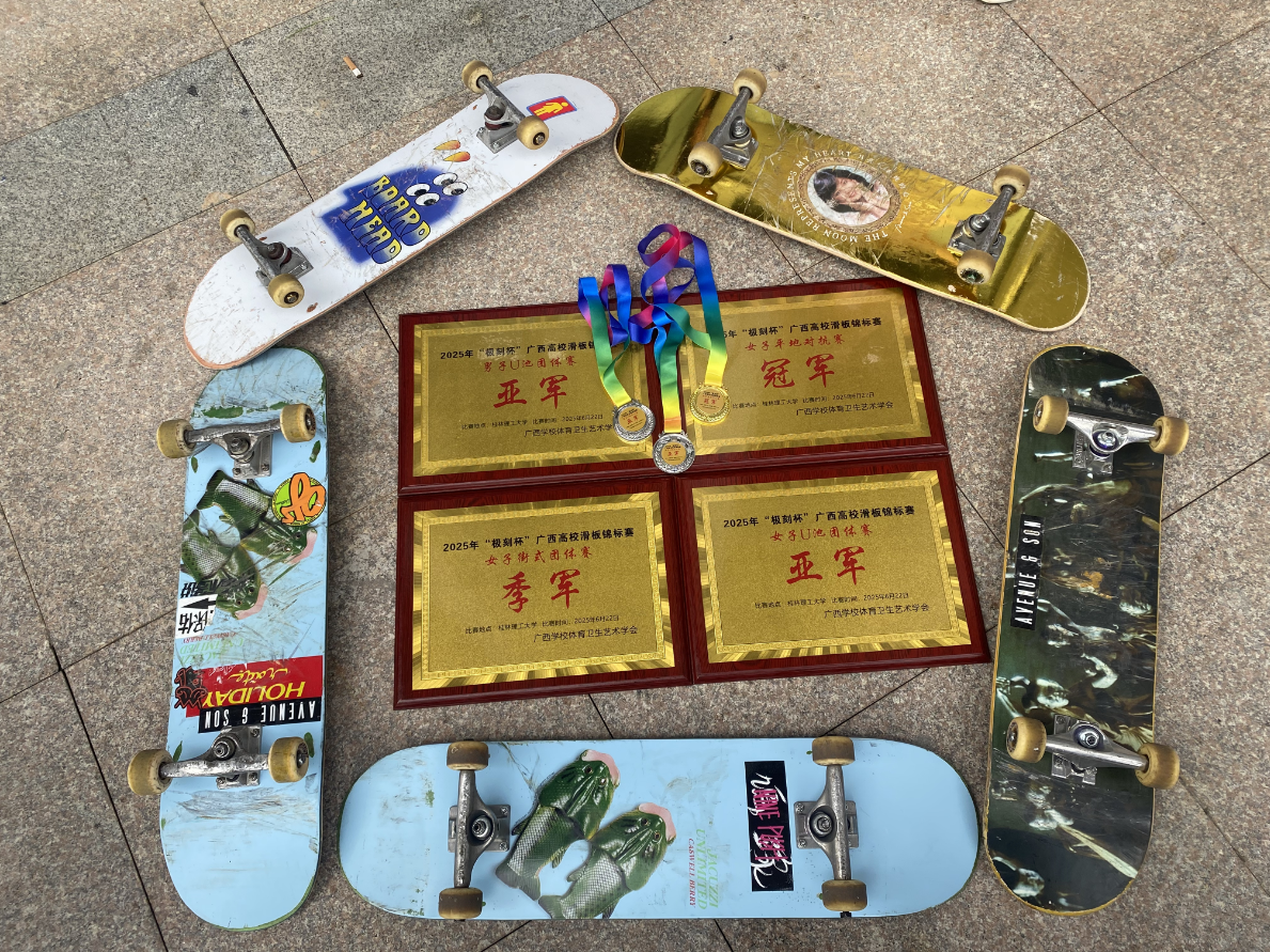 2025年“极刻杯”广西高校滑板锦标赛于近日收官,在“新活力体育产业学院”大力支持下,taptap点点滑板队在龙波、胡纯林、刘昆三位老师的带队指导下,以强劲实力横扫多个项目,其中徐志芳成为双冠王,团队在U池与街式项目中屡创突破,展现高校滑板运动的青春力量。