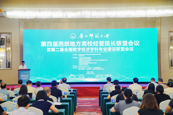 广西师范大学党委常委、副校长宋树祥在致辞中指出,数字经济与千行百业的深度融合正催生新业态、新模式、新产业,为经济社会发展注入新动能。会议通过汇聚多方智慧,不仅为数字经济学科专业建设提供了新思路、新方法,更搭建了校际合作与政产学研协同创新的平台。中国西部研究与发展促进会数字经济专业委员会会长孙启明强调,产教融合是 数字经济发展的重要抓手,高校需立足新一代信息技术、集成电路、智能制造、生物医药、新材料等战略产业需求,优化专业布局,强化人才培养的针对性。咸阳师范学院副校长、西部地方高校经管院长联盟理事会会长姚波则提出,地方高校需肩负服务国家战略与推动学科变革的双重使命,探索新文科背景下经管学科与计算机科学、统计学等学科的交叉融合路径,创新跨校联合培养模式,共建学科创新联合体。