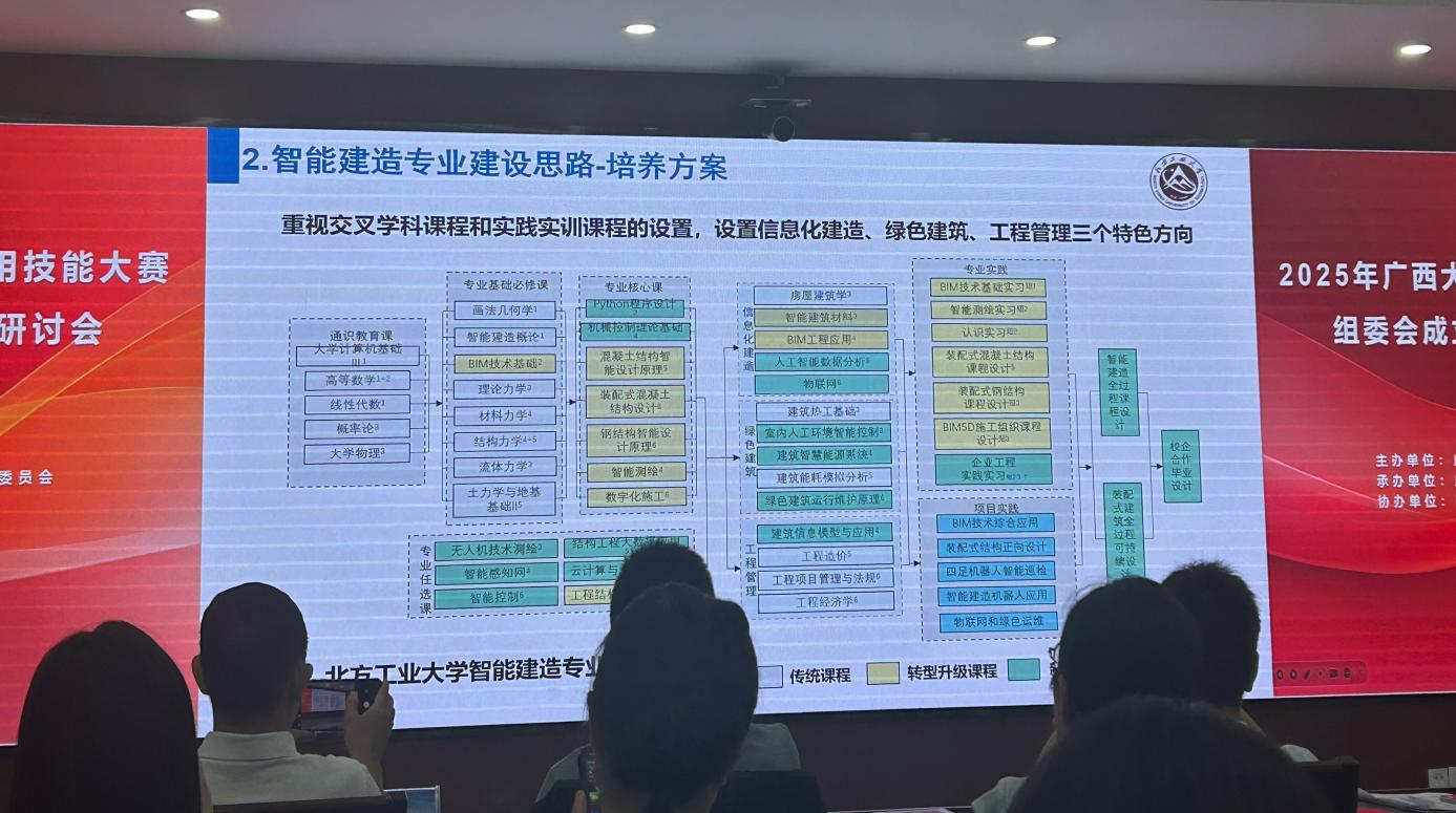 2025年6月30日,在智能建造产业学院的大力支持下,土木与工程学院赴广西大学参加广西大学生智能建造应用技能大赛组委会成立大会暨智能建造研讨会。鲁金金院长、教师雷静等人到会。