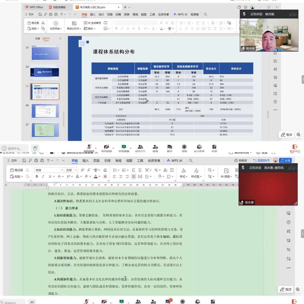 其次,电子商务教研室主任唐莉琼对电子商务专业的人才培养方案进行了汇报。唐主任介绍了该专业在数字化时代的发展机遇和挑战,并详细阐述了培养方案的特色和亮点。她表示,电子商务专业注重培养学生的数字营销、数据分析和电商运营等能力,通过与企业的紧密合作,为学生提供丰富的实践机会。喻光继教授和高永惠研究员对电子商务专业人才培养方案进行了点评。喻教授对方案的实用性和针对性给予了高度评价,并建议加强对学生创业能力的培养。高研究员则从行业发展的趋势出发,提出了一些具有前瞻性的建议,如加强对新兴技术的应用和研究,培养方案中培养目标、毕业要求、专业能力指标逻辑强强对应给与了建议。