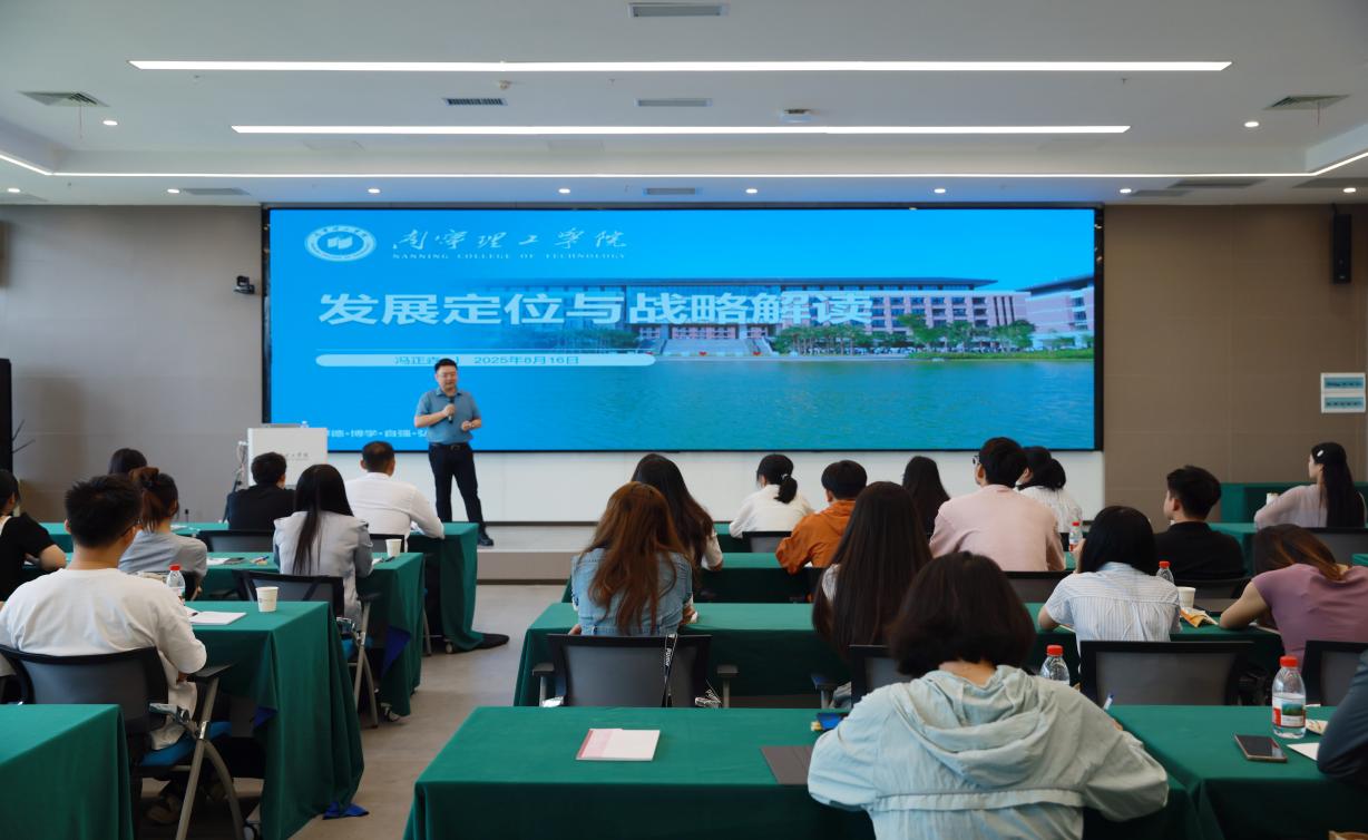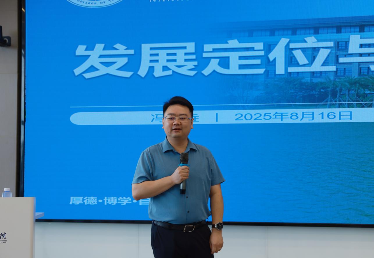 冯正垚副董事长围绕学校办学初心与使命、发展现状、战略定位与目标,以及辅导员角色思考、未来愿景等内容,回顾了学校从创建至今扎根八桂、服务广西-东盟区域发展的20余年办学历史,系统分析了当前高等教育面临的机遇与挑战,全面讲解了学校的办学特色与亮点。他指出,学校始终坚守“为党育人、为国育才”的使命,凝练出“高端化、全球化、个性化”的发展战略和“育人为本、质量立校、特色强校”的办学理念,着力培养“思想品德优良、知识结构合理、实践能力突出、具有创新意识和国际视野”的高素质应用型人才。他强调,辅导员是学校战略落地的“最后一公里”,与学生同频、与时代同步、与学校同心,才能实现个人与学校的价值的共同提升。他倡议全体辅导员以“务实姿态”融入战略大局,用“时时在线”的专业精神和“事事关心”的教育情怀,在价值引领、全球胜任力培养、个性化发展指导等方面精准发力,跑出新时期南理辅导员的“加速度”。