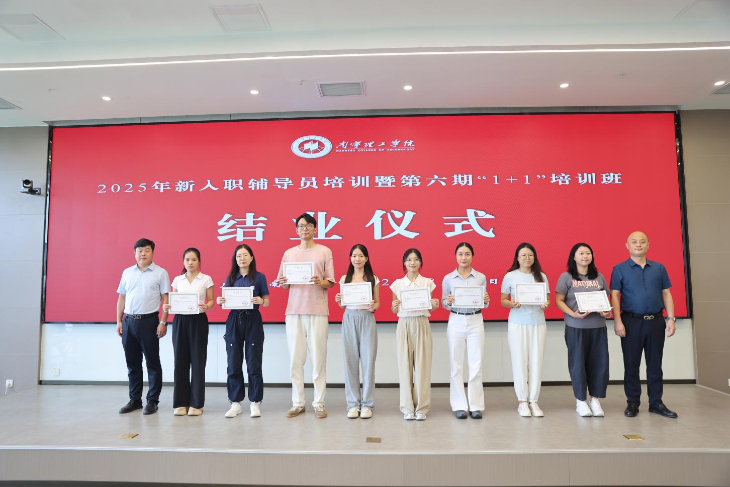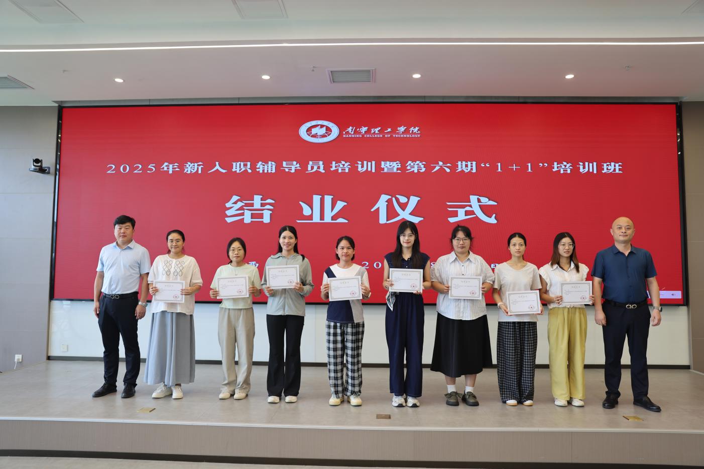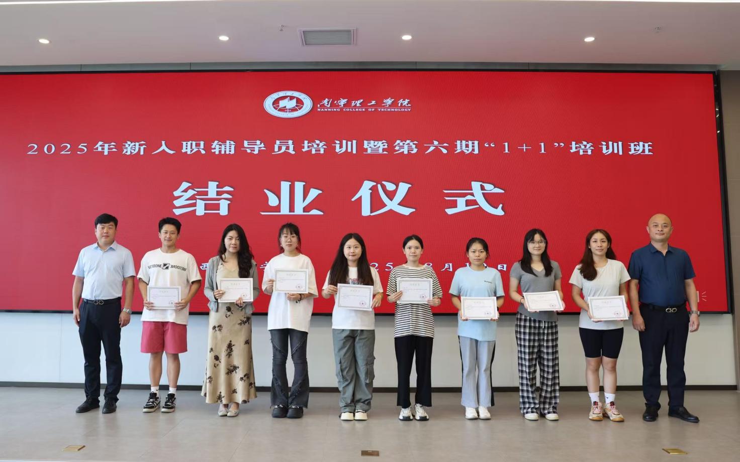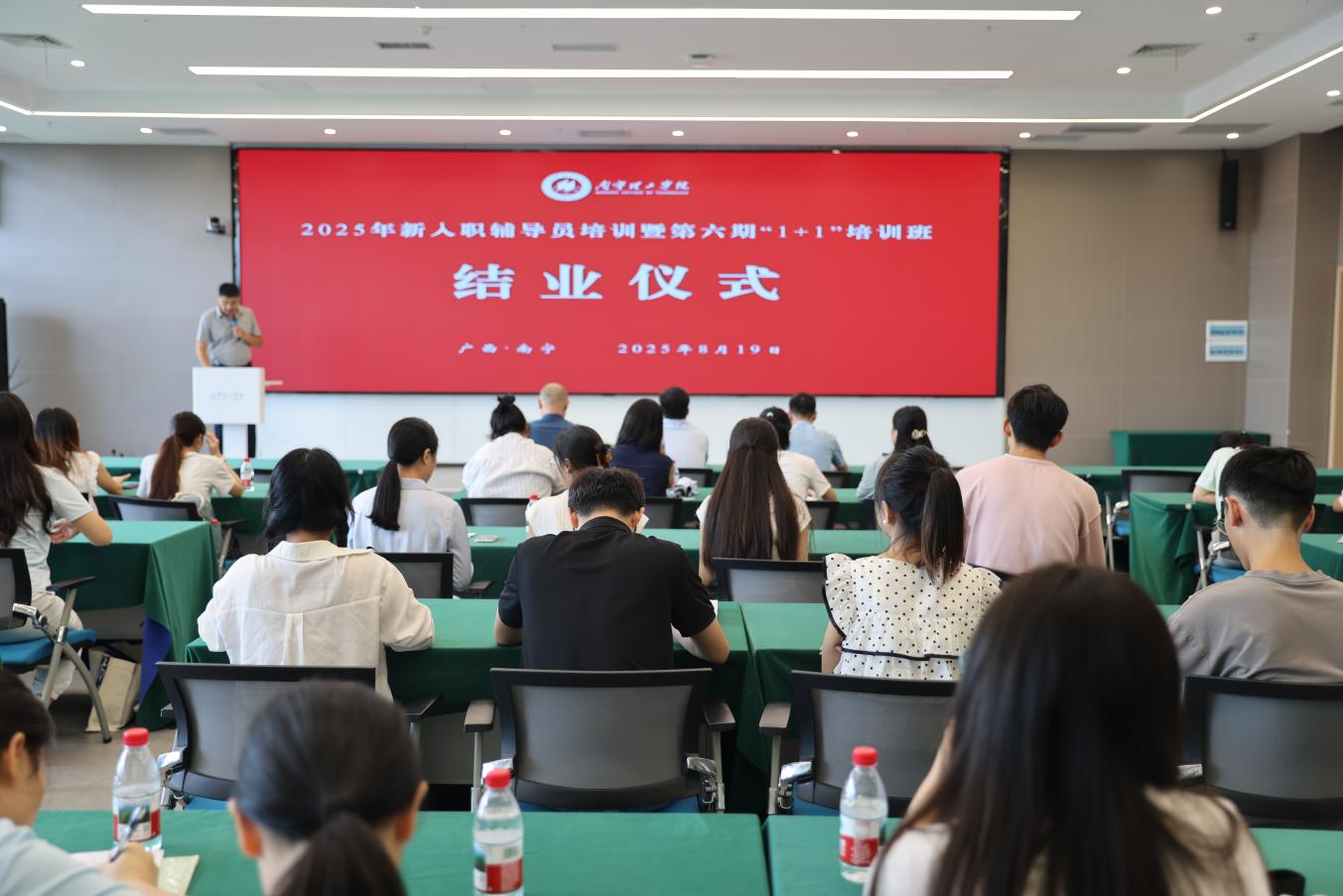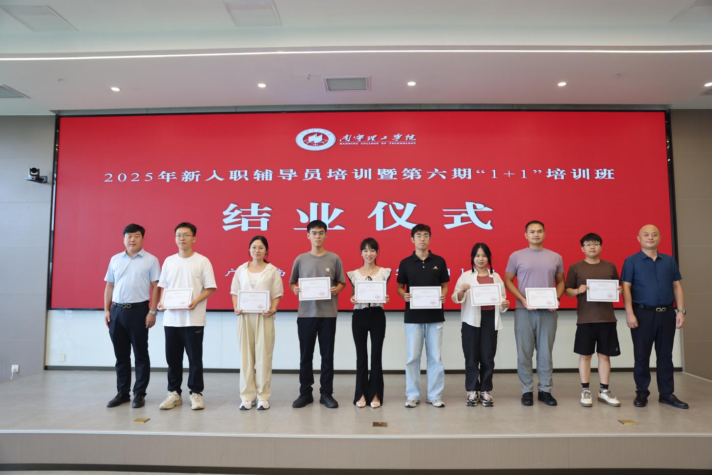 为进一步凝聚立德树人共识、巩固培训成果,8月19日下午,学校在南宁校区图书馆618会议室隆重举行2025年新入职辅导员培训暨第六期“1+1”辅导员培训班结业仪式。学校党委副书记、副校长韩乔,纪委书记、校长助理马纪涛及二级学院党总支书记出席,仪式由学生工作处副处长孙宝会主持,现场氛围庄重而热烈。