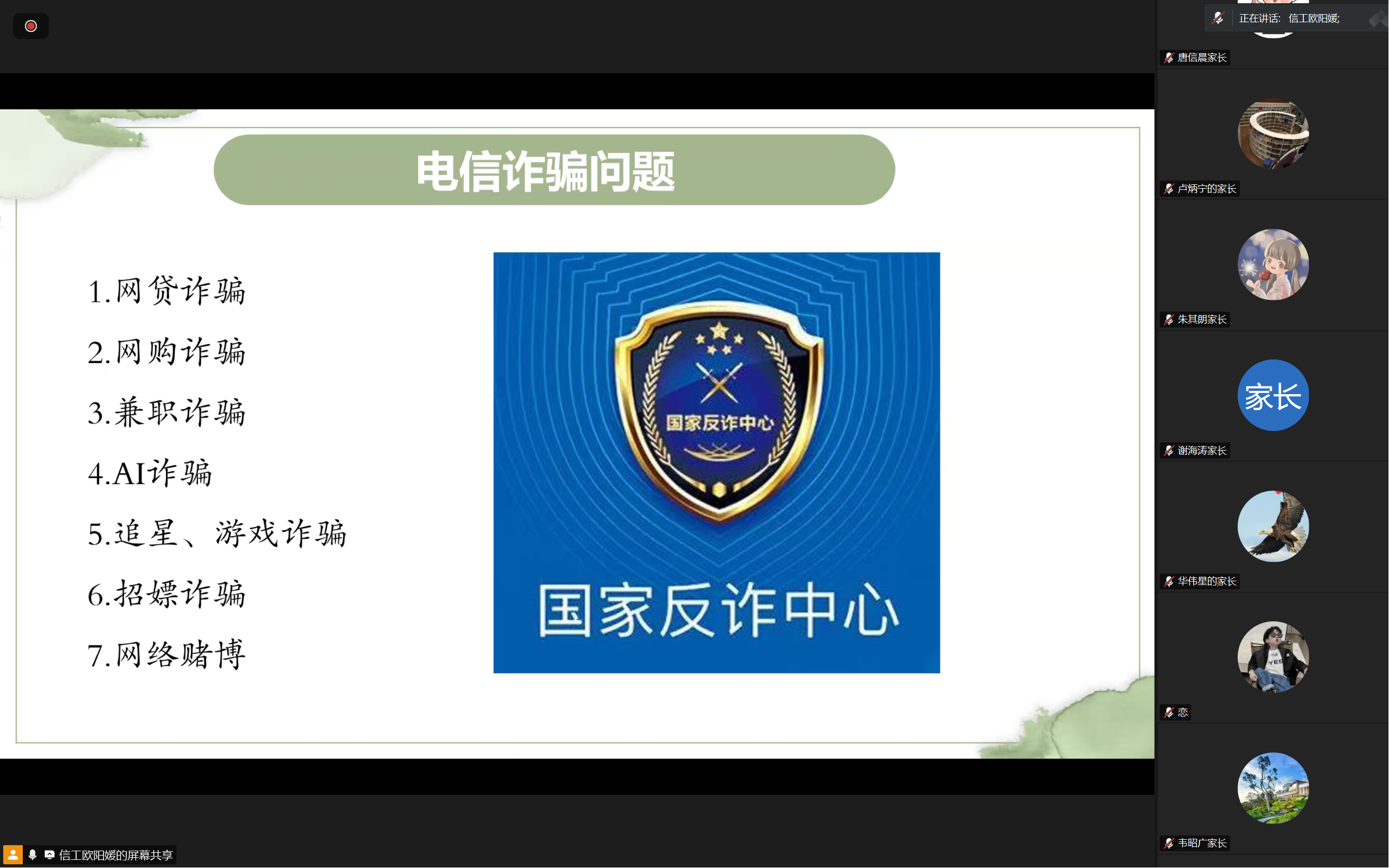 此外,本次“云·家访”还重点强调暑期安全防护。辅导员结合近期典型案例,系统讲解防溺水、交通安全、电信诈骗预防、疾病防控等知识;针对部分因学业压力产生情绪波动的学生,辅导员与家长深入沟通其心理状态,共同探讨家庭关怀与情绪疏导的有效方法,切实筑牢学生暑期安全与心理健康双重防线。