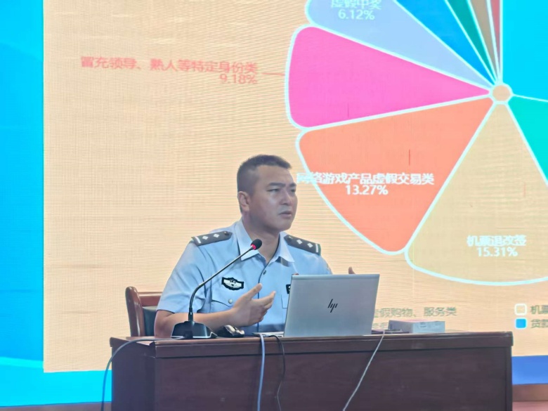 李灵希大队长结合身边常见的电信网络诈骗典型案例,用数据和真实事件清晰呈现当前电信网络诈骗的严峻形势——诈骗案件持续高发,且手段不断迭代升级,逐渐向校园场景渗透,对大学生群体的财产安全构成显著威胁。而后,详细剖析了网络刷单返利、冒充公检法、虚假购物退款等常见电信诈骗手段的作案流程与识别要点。针对大学生群体特点,他重点强调了校园贷、冒充学长学姐收费、求职诈骗等高频风险类型,提醒同学们警惕各类针对学生的诈骗陷阱。最后,他叮嘱同学们,要始终保持理性判断,对不明来源的信息、链接及要求转账的行为提高警惕,做到“不轻信、不透露、不转账”,牢记八个“凡是”,及时下载安装国家反诈中心APP等。